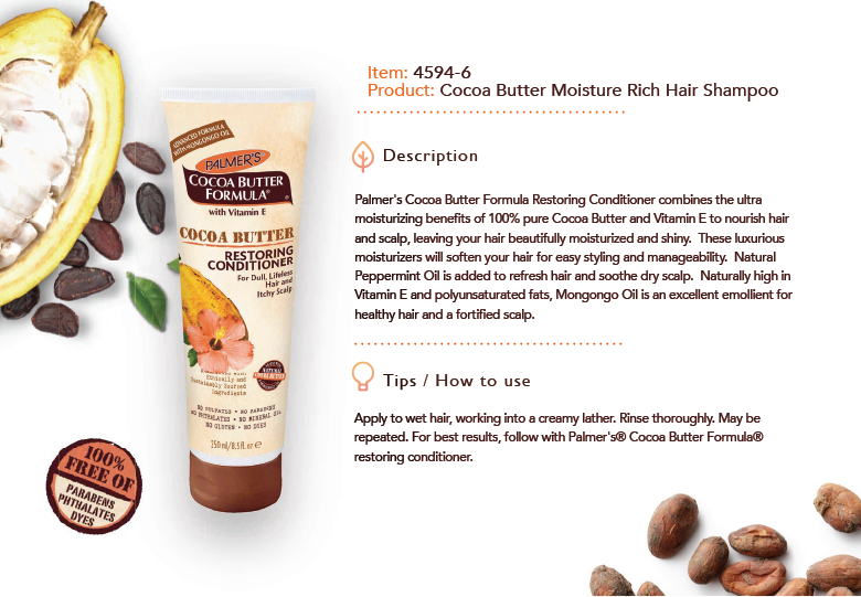 Palmer’s Cocoa Butter Formula Restoring Conditioner combines the ultra moisturizing benefits of 100% pure Cocoa Butter and Vitamin E to nourish hair and scalp, leaving your hair beautifully moisturized and shiny. These luxurious moisturizers will soften your hair for easy styling and manageability. Natural Peppermint Oil is added to refresh hair and soothe dry scalp. Naturally high in Vitamin E and polyunsaturated fats, Mongongo Oil is an excellent emollient for healthy hair and a fortified scalp.