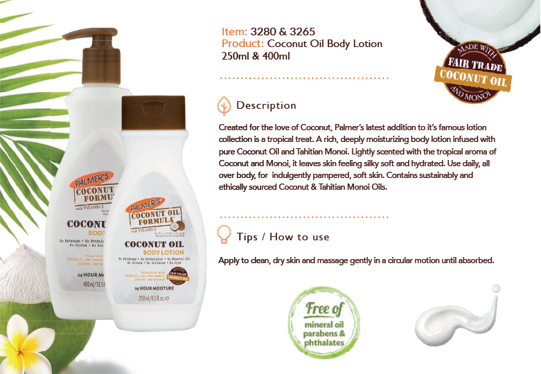 Created for the love of Coconut, Palmer’s latest addition to it’s famous lotion collection is a tropical treat. A rich, deeply moisturizing body lotion infused with pure Coconut Oil and Tahitian Monoi. Lightly scented with the tropical aroma of Coconut and Monoi, it leaves skin feeling silky soft and hydrated. Use daily, all over body, for indulgently pampered , soft skin. Contains sustainably ad ethically sourced coconut & Tahitian Monoi oils.