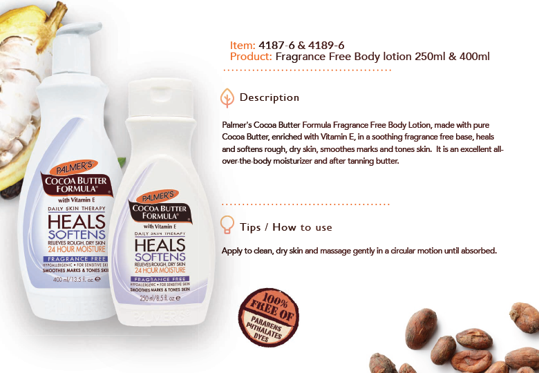 Palmer’s Cocoa Butter Formula Fragrance Free Body Lotion, made with pure Cocoa Butter, enriched with Vitamin E, in a soothing fragrance free base, heals and softens rough, dry skin, Smooths marks and tones skin. It is an excellent all-over-the-body moisturizer and after tanning butter.