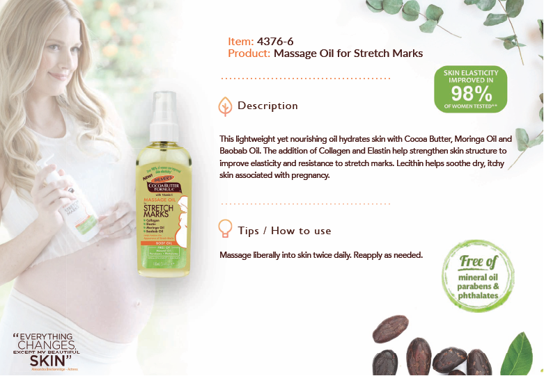 This lightweight yet nourishing oil hydrates skin with Cocoa Butter, Moringa Oil and Baobab Oil. The addition of Collagen and Elastin help strengthen skin structure to improve elasticity and resistance to stretch marks. Lecithin helps soothe dry, itchy skin associated with pregnancy
